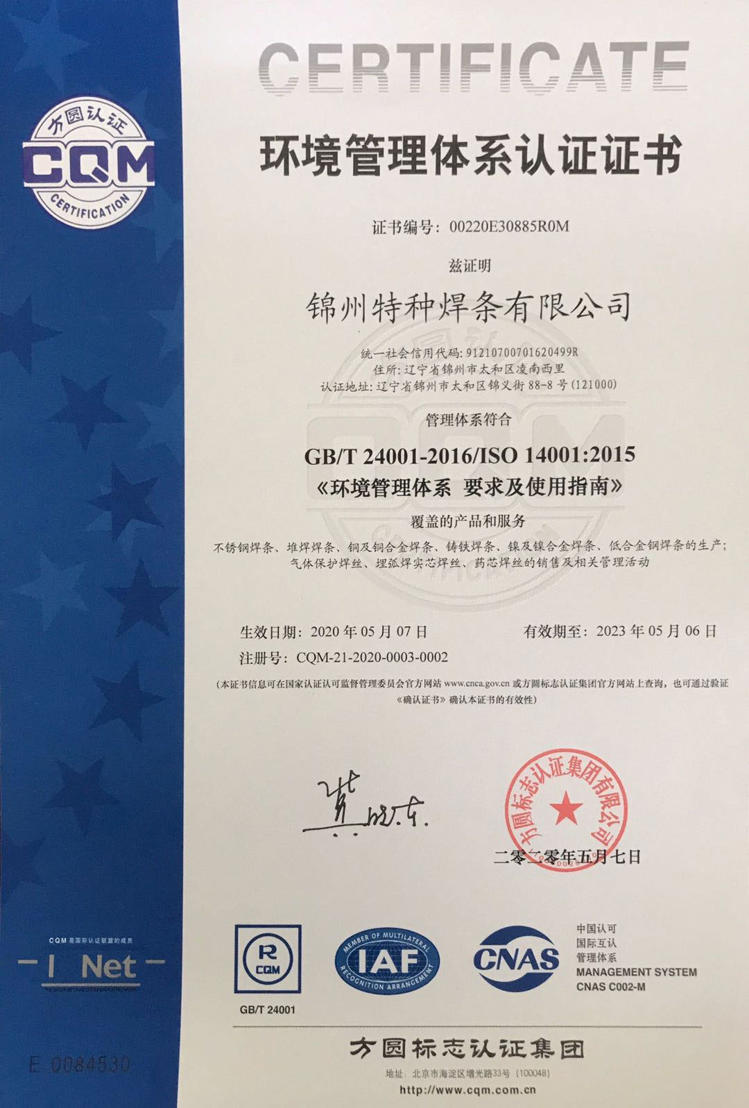 Certification Name:環(huán)境管理體系認(rèn)證證書